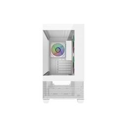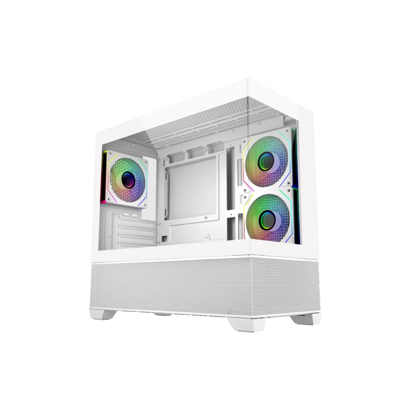 El Elite 490 ofrece un diseño moderno y limpio en un formato mATX compacto, ideal para setups minimalistas sin sacrificar rendimiento. Sus paneles de vidrio templado en el frontal y lateral permiten una vista amplia y sin interrupciones del interior, resaltando la iluminación y los componentes de tu PC.