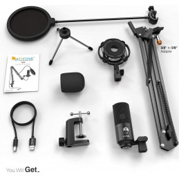 El paquete de accesorios incluye: el soporte de brazo de tijera está hecho de construcción de acero, resistente y duradero. Un soporte de choque de grado de estudio, un filtro de pop doble, cable USB de alta calidad de 9.2 ft, un soporte de trípode adicional, un micrófono para grabación de podcast, un manual de usuario y soporte técnico gratuito. Un año de garantía a 2 años de garantía extendida con registro en línea.
